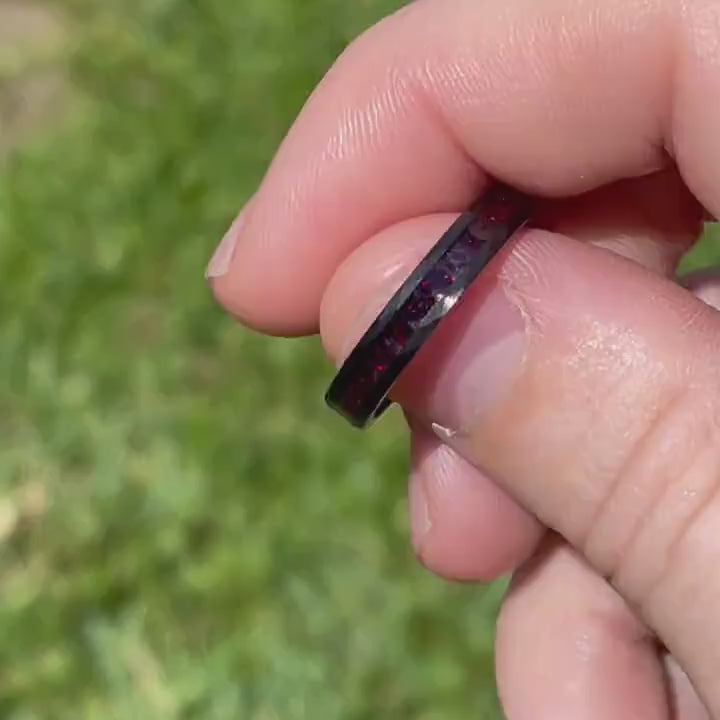 ►This hand crafted tungsten ring features brushed, hammered tungsten and beautiful crushed black fire opal. Having an incredible resistance to scratching, your tungsten band is 4 times harder than titanium, 5 times harder than steel, and 10 times harder than gold. Its hardness is second only to diamonds. Tungsten will maintain its luster, beauty, and shape forever. Its eternal strength is the perfect symbol of eternal love.