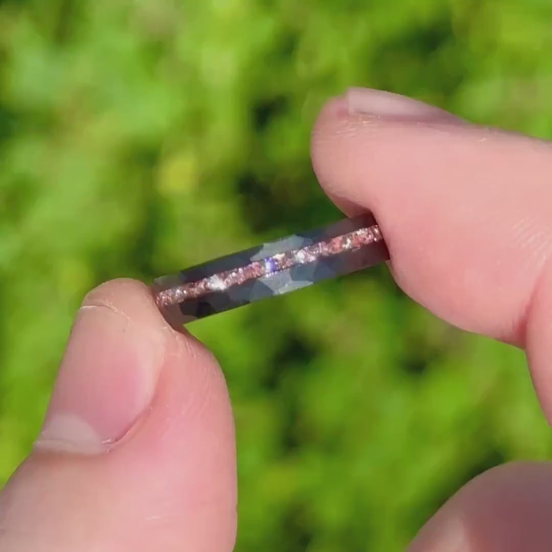 Hammered MORGANITE Ring Black Tungsten Band, Offset Crushed Morganite Glass Stone, 4mm Man Woman Wedding Band, Matte Brush, Ring Engrave