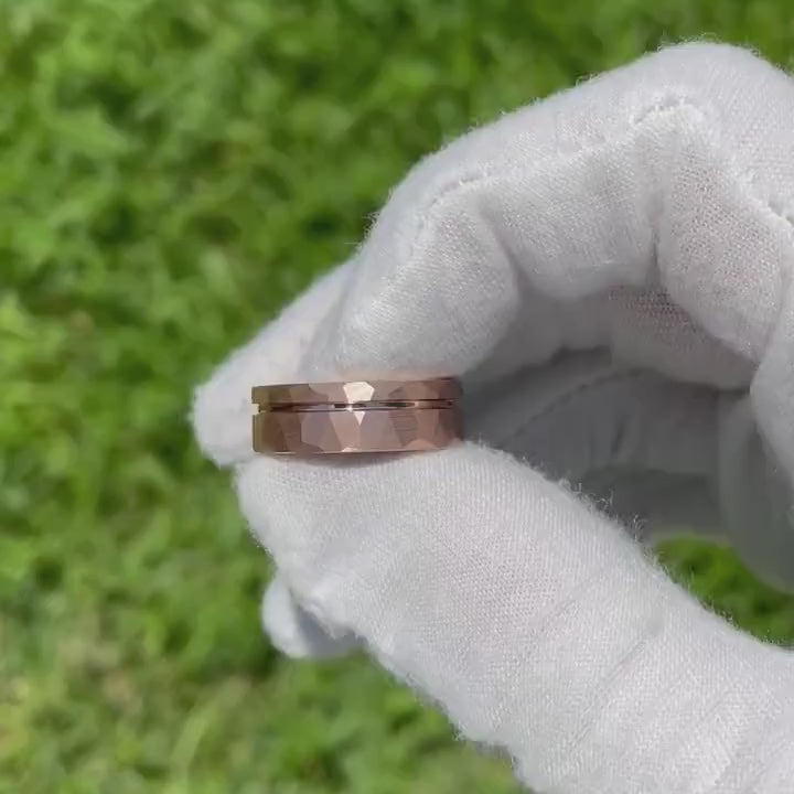 Introducing our Hammered Rose Gold Tungsten Ring, a stunning 7mm men's wedding band that exudes simplicity and uniqueness. Handmade with meticulous attention to detail, this custom engraved ring is crafted from high-quality tungsten, known for its durability and scratch-resistant properties. The band features a flat offset groove design, adding a touch of elegance to its overall aesthetic.