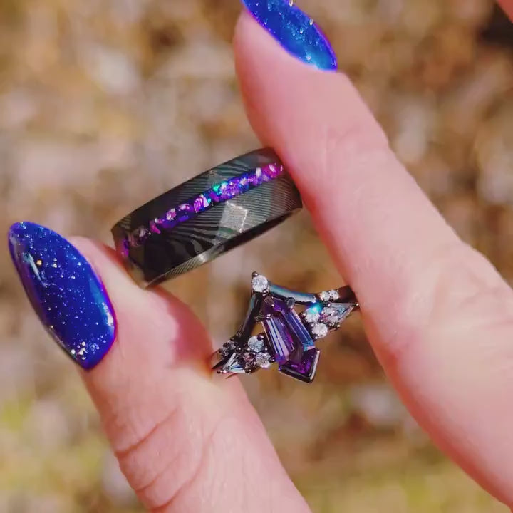 His and Her Alexandrite Galaxy Ring Set, Crab Nebula Alternative Wedding Ring Set, Couple Rings, Black Damascus Ring, Engagement Ring Set
