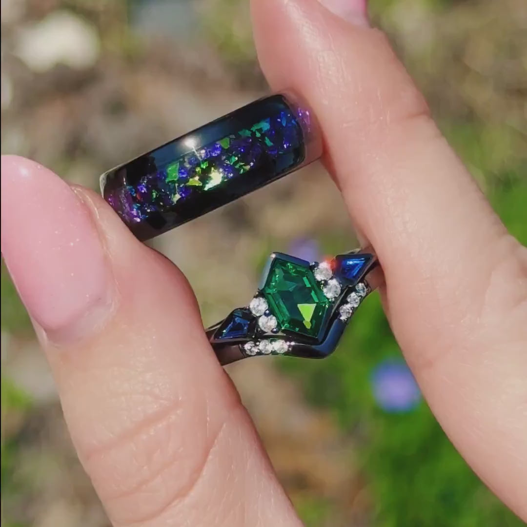 ►The Ghost Nebula Ring Set is a breathtaking galaxy-inspired design that features matching black wedding bands with vibrant blue sapphire and green tsavorite accents. These couples rings make an exceptional choice, whether as a wedding ring or a heartfelt promise ring and are perfect for a unique anniversary gift. With the option for custom engraving, these matching bands become a personalized and timeless symbol of your love and shared journey, capturing the beauty of the cosmos in every detail.