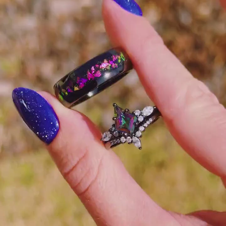 His and Her Mystic Topaz Galaxy Ring Set, Cass Supernova, Black Engagement Ring Set, Unique Couple Ring, Alternative Wedding Ring, Engraving
