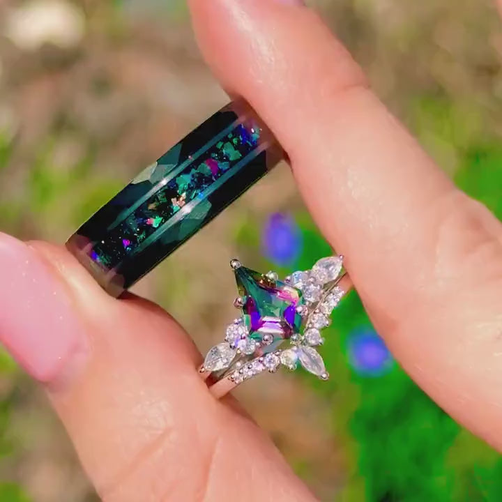 ►The His and Her Mystic Topaz Galaxy Ring Set, inspired by the Cass Supernova, offers a breathtaking design perfect for those seeking a unique couple ring. This alternative wedding ring set, featuring mesmerizing mystic topaz stones, beautifully captures the cosmic bond between partners. Ideal as a wedding ring, promise ring, or a thoughtful anniversary gift, this matching engagement ring set symbolizes your shared journey through the stars. Custom engraving adds a personal touch, making these rings an unforgettable and lasting tribute to your love.
