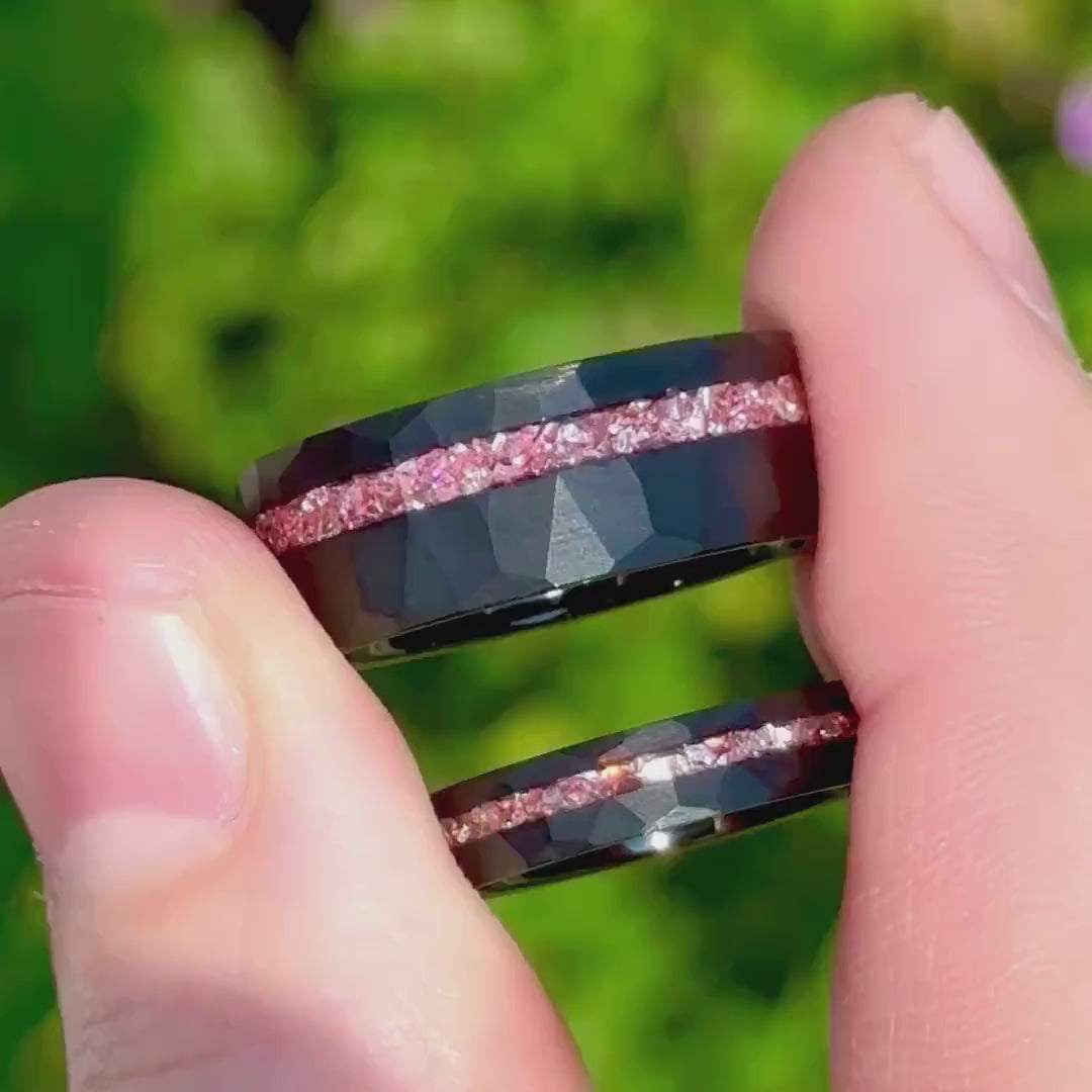 ►The His and Hers Morganite Ring Set features black tungsten bands with hammered textures and stunning Morganite glass stones. This 8mm & 4mm matching couples ring set is perfect for a wedding, promise, or anniversary gift. The unique design captures the beauty of your bond, and custom engraving adds a personal touch, turning these rings into timeless symbols of your commitment and shared journey.