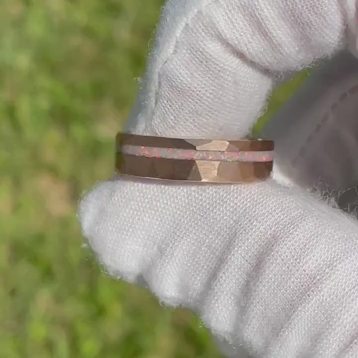 His and Hers Tungsten Wedding Band, Crushed White Fire Opal, 6mm & 4mm Rings, Rose Gold Plated Ring, Hammer, Flat, Brushed, Comfort Fit
