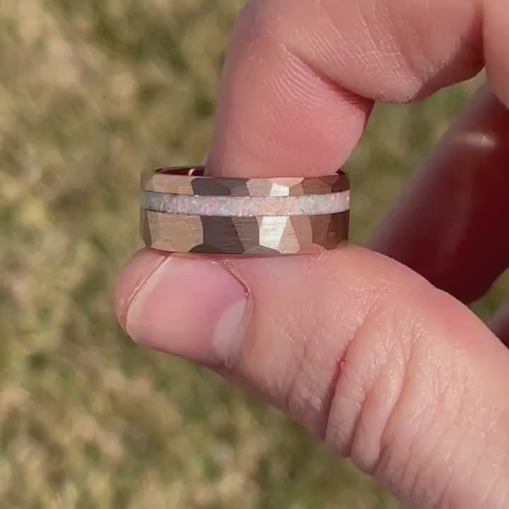His and Hers Tungsten Wedding Band, Crushed White Fire Opal, 8mm & 4mm Rings, Rose Gold Plated Ring, Hammer, Flat, Brushed, Comfort Fit