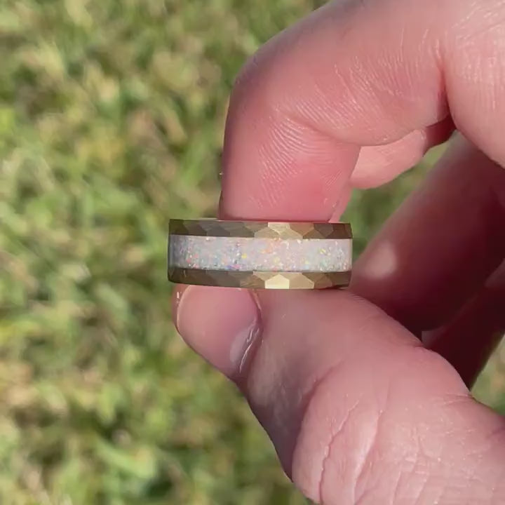 ►This hand crafted tungsten ring features brushed, hammered tungsten and beautiful crushed white fire opal. Having an incredible resistance to scratching, your tungsten band is 4 times harder than titanium, 5 times harder than steel, and 10 times harder than gold. Its hardness is second only to diamonds. Tungsten will maintain its luster, beauty, and shape forever. Its eternal strength is the perfect symbol of eternal love.