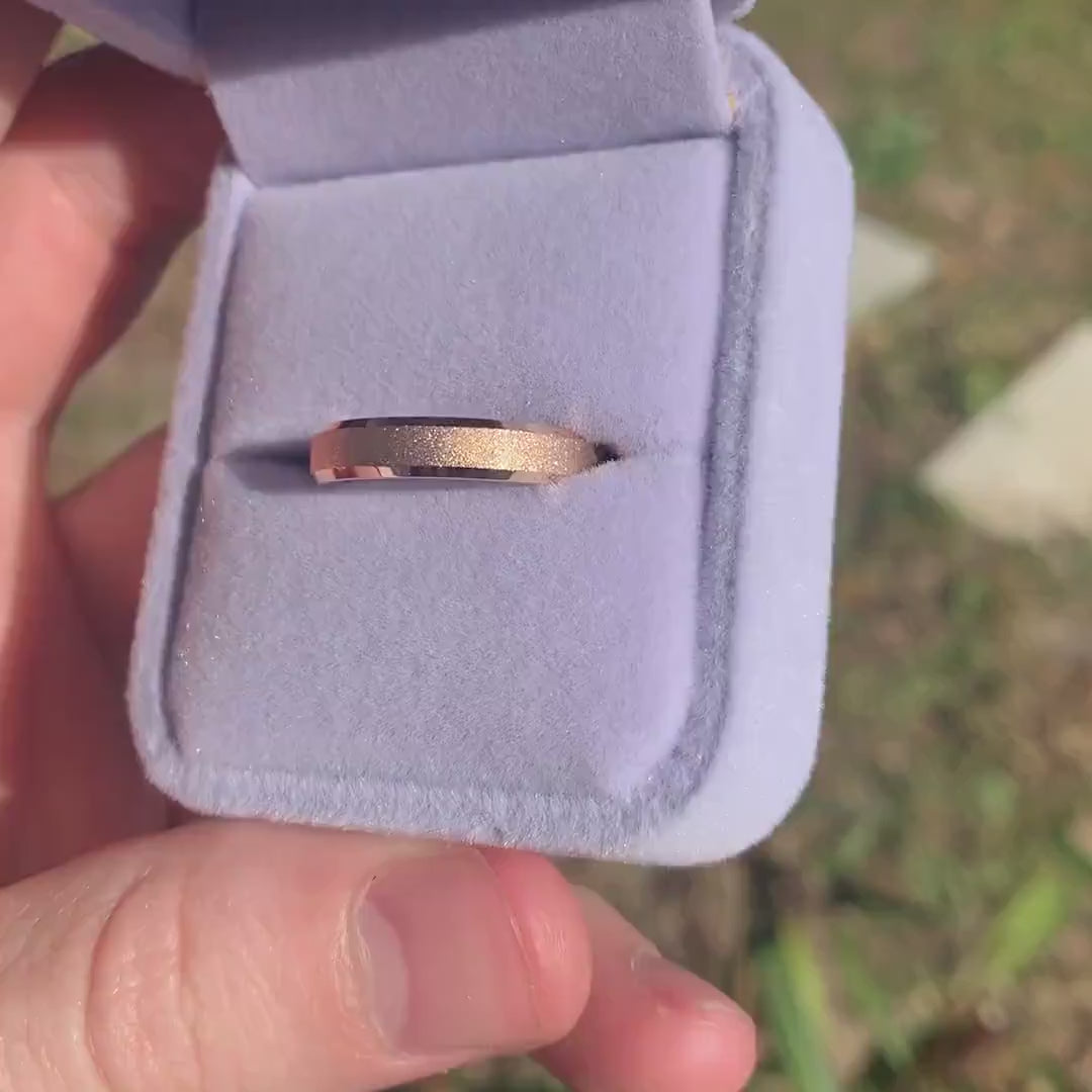 ►This His and Hers Tungsten Wedding Band Set features 6mm and 4mm rose gold tungsten rings with a sandblasted texture and beveled edges, offering a modern, unique design. The flat shape and comfort fit ensure a perfect blend of style and wearability for any occasion. Ideal as a wedding ring, promise ring, or a thoughtful anniversary gift, this set is a timeless choice. Add engraving to create a personalized touch that captures your love and commitment in a truly special way.