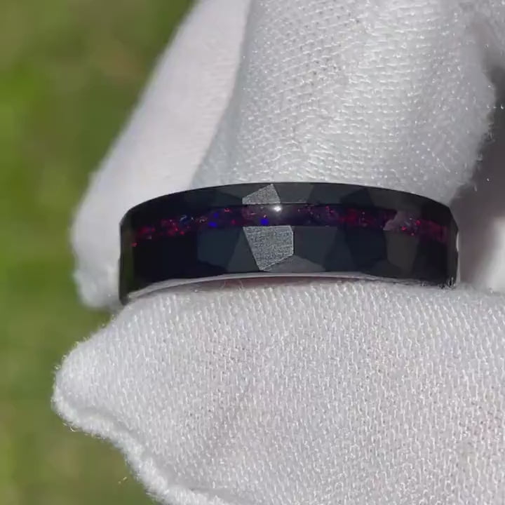 ►This hand crafted tungsten ring features brushed, hammered tungsten and beautiful crushed black fire opal. Having an incredible resistance to scratching, your tungsten band is 4 times harder than titanium, 5 times harder than steel, and 10 times harder than gold. Its hardness is second only to diamonds. Tungsten will maintain its luster, beauty, and shape forever. Its eternal strength is the perfect symbol of eternal love.