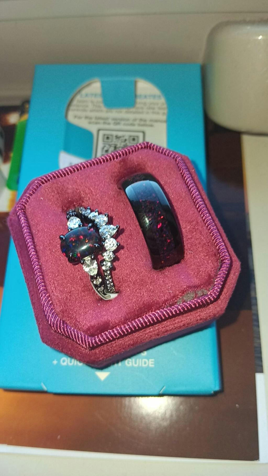 ►This Wedding Band Set pairs the timeless elegance of black fire opal inlays with the bold sophistication of black rhodium sterling silver and black tungsten bands. Perfect as a wedding ring, a meaningful promise ring, or a unique anniversary gift, this couples ring set beautifully symbolizes your enduring connection. Personalize the set with engraving to create a distinctive keepsake, making these rings a lasting tribute to your shared journey and love story.