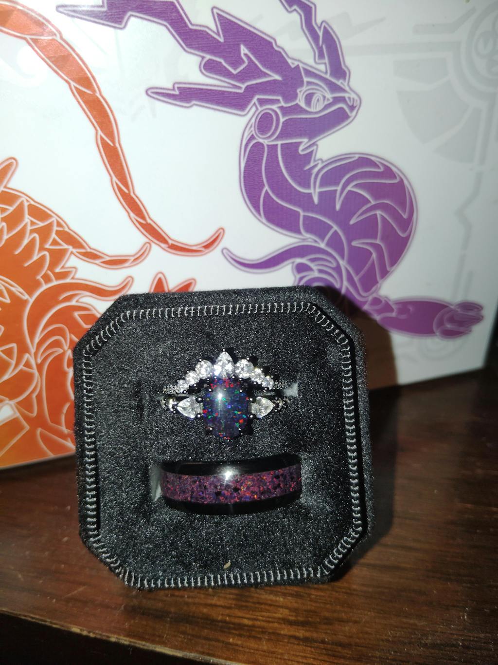 ►His ring is Tungsten Carbide with Crushed Black Fire Opal Inlay