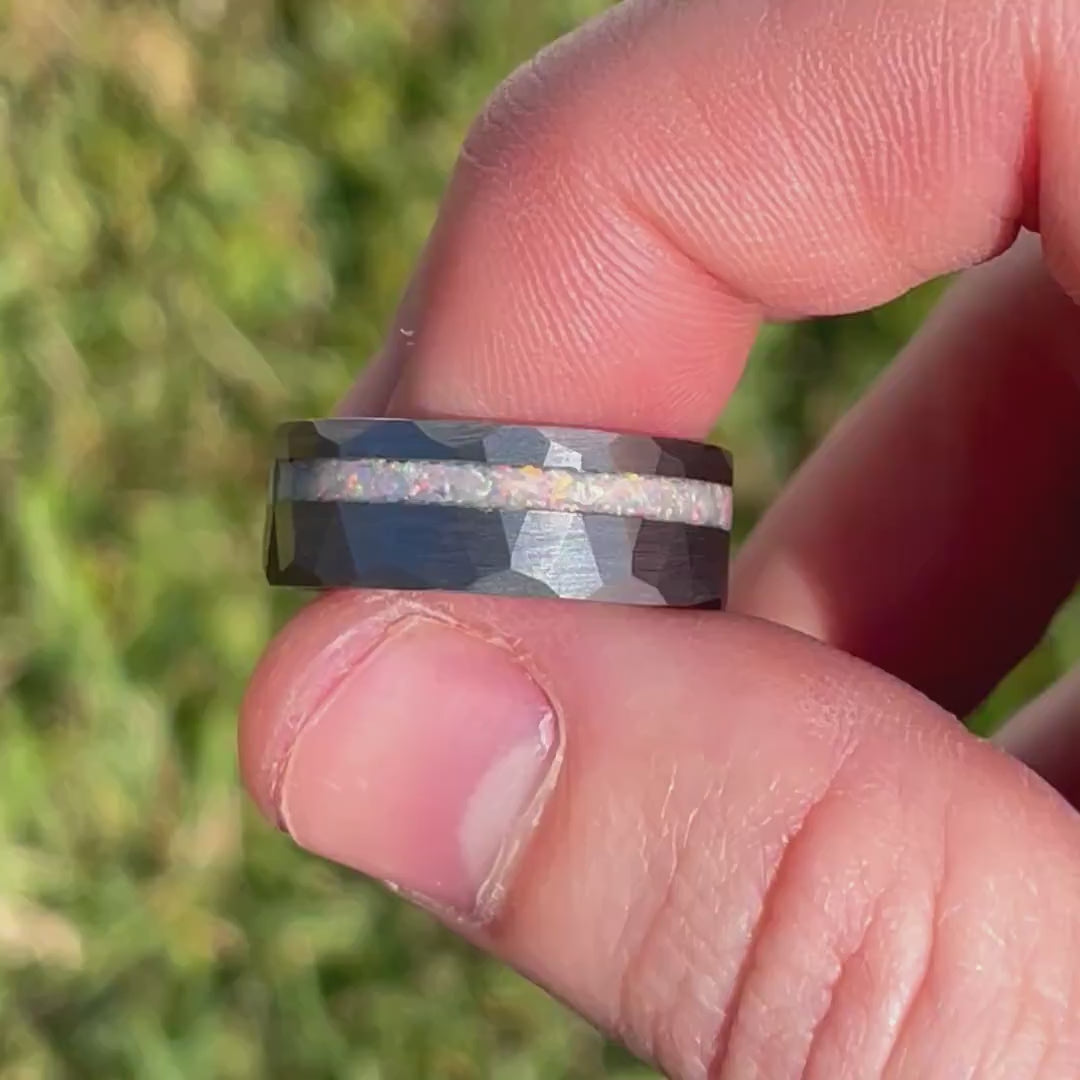 ►His ring is Tungsten Carbide with Crushed White Fire Opal Inlay