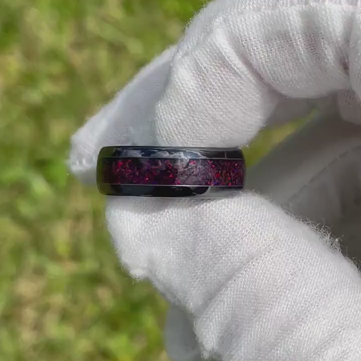 His Her Black Opal Ring Set, Ceramic Wedding Band Set, Black Fire Opal, Personalized Gift, Promise Ring Couples, Polish, Dome, Black Ring