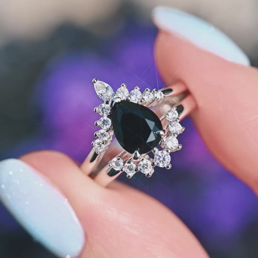 Lava Rock & Black Onyx Couples Ring Set – a striking blend of strength and symbolism. His ring features hammered tungsten with volcanic lava rock, while hers showcases a black onyx set in sterling silver. A bold promise ring set perfect for couples who want something meaningful and unique.