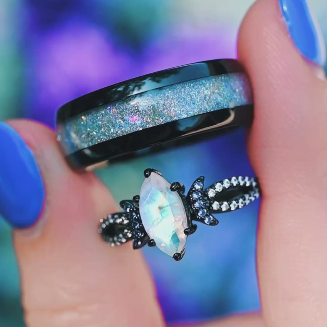 Lunara Couples Moonstone Ring Set, His and Her Wedding Ring Set, Unique Promise Ring, Crescent Moon, Black Fantasy Ring for Couples
