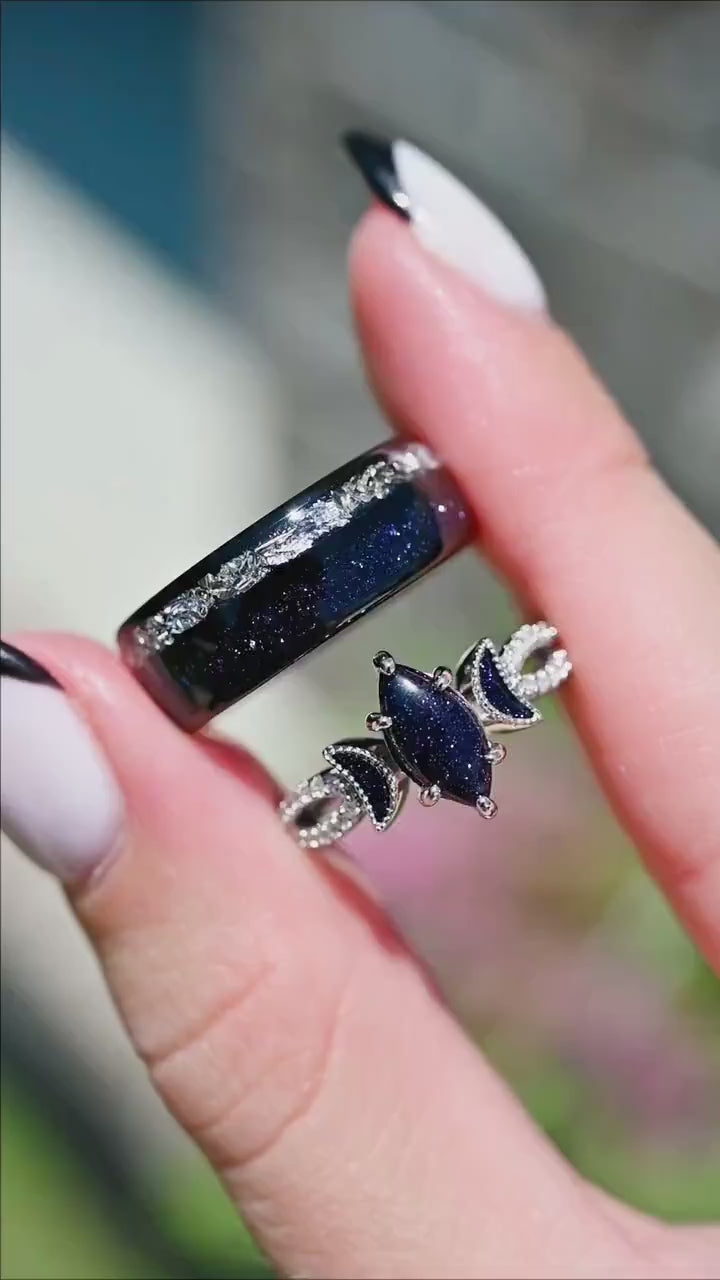 Discover the cosmos with the Lunara Starry Night Ring Set. This unique couples ring set, inspired by the Great Rift Nebula, is perfect for engagements, weddings, or promises. Personalize them with a custom engraving for a special touch.