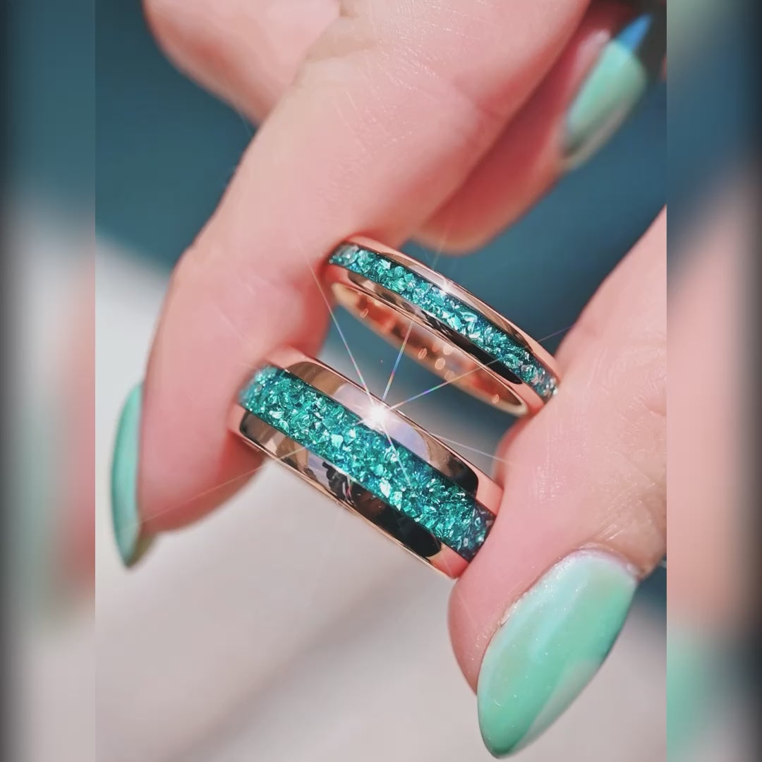 ►This aquamarine band combines the elegance of rose gold with the durability of an 8mm tungsten dome design, featuring a polished finish and crushed aquamarine inlay. Perfect as a wedding ring or a meaningful promise ring, it also makes a thoughtful anniversary gift for someone special. Add a personal touch with custom engraving to create a timeless symbol of love and commitment that reflects your unique story.