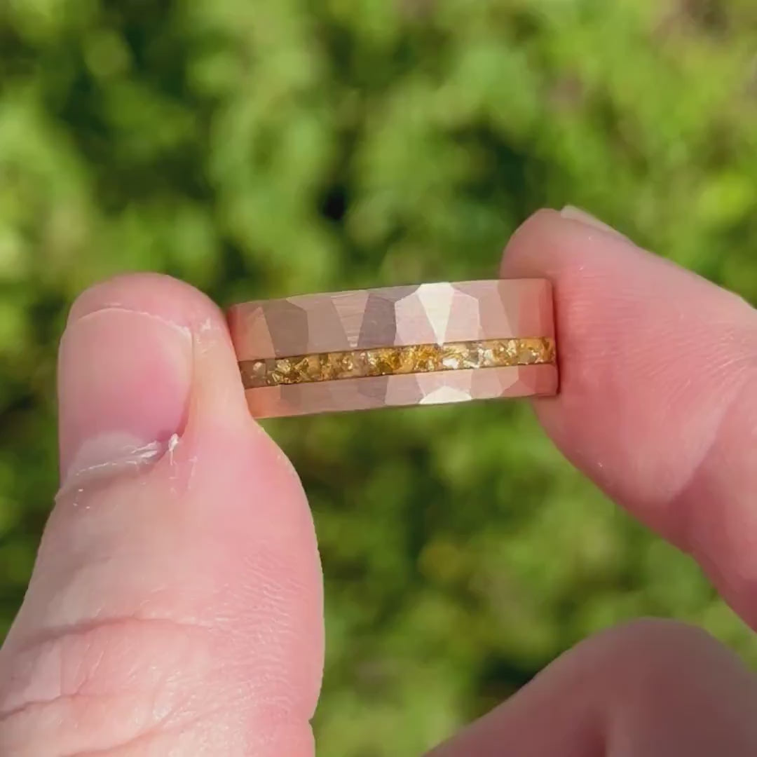 ►This hammered rose gold tungsten ring with a striking citrine inlay combines rugged elegance and modern style. The flat, hammered 8mm design makes it an excellent choice for a wedding ring, a meaningful promise ring, or a distinctive anniversary gift. Add engraving to personalize this unique piece, creating a lasting symbol of love and commitment that reflects your story.