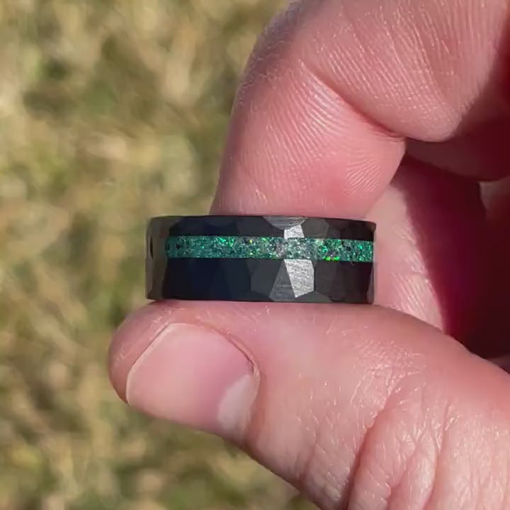 ►This black tungsten ring with a vibrant emerald fire opal inlay combines bold design with durability. The hammered, brushed flat band, available in 8mm or 6mm, makes it a unique wedding ring or a heartfelt promise ring. Its striking green hue and modern craftsmanship also make it a thoughtful anniversary gift. Add engraving to create a personalized piece that symbolizes your love and commitment.