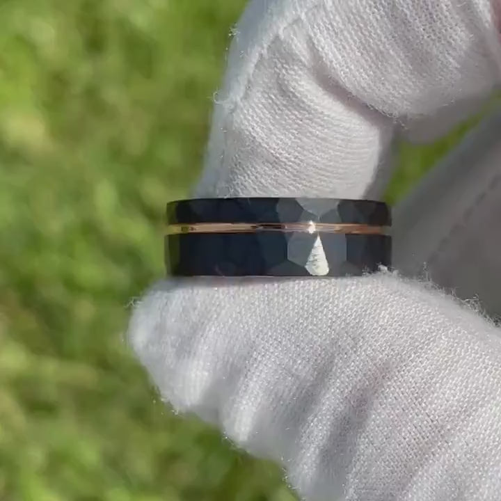 This stunning handmade tungsten ring has a hammered black finish and a striking rose gold accent. It's perfect for a men's wedding band or engagement ring, combining durability and elegance. Custom engraving is also available for a personal touch.