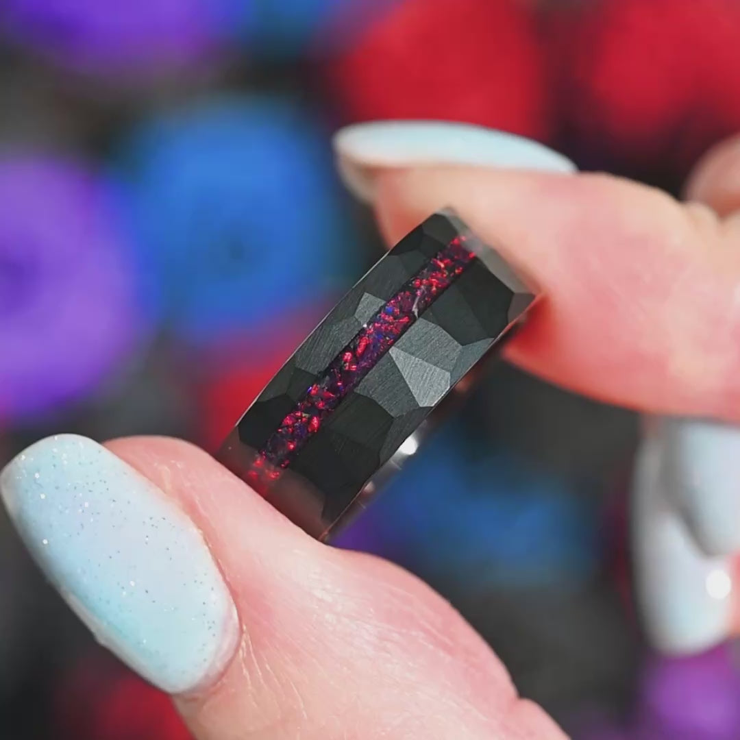 ►This hand crafted tungsten ring features brushed, hammered tungsten and beautiful crushed black fire opal. Having an incredible resistance to scratching, your tungsten band is 4 times harder than titanium, 5 times harder than steel, and 10 times harder than gold. Its hardness is second only to diamonds. Tungsten will maintain its luster, beauty, and shape forever. Its eternal strength is the perfect symbol of eternal love.