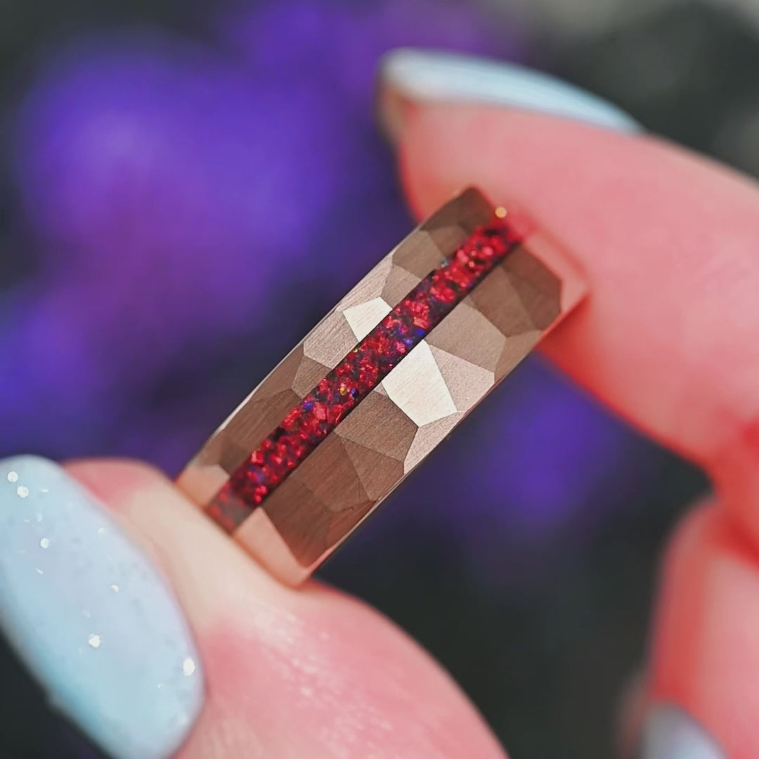 Men Black Opal Tungsten Band, Rose Gold Wedding Ring, Hammered, Flat, 8mm Crushed Black Fire Opal, Matte Brushed, Unique Ring for Him
