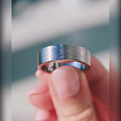 This men’s gemstone band showcases four round-cut lab-grown alexandrite gemstones set in a flat, brushed sterling silver band. Finished in black ruthenium plating, it delivers a sleek, modern look with subtle color-changing depth. A versatile men’s wedding band, ideal as a promise ring or engagement ring for him.