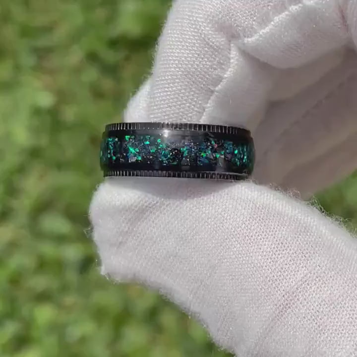 ►This Black Galaxy Opal Ring, crafted from durable titanium, features a stunning opal inlay with intricate milgrain detailing and a polished domed finish. Its comfort fit ensures all-day wear, making it a meaningful choice as a wedding ring or promise ring that symbolizes a unique connection. Perfect as an anniversary gift or birthday present for him, this striking band can also be personalized with custom engraving for a truly unforgettable touch.