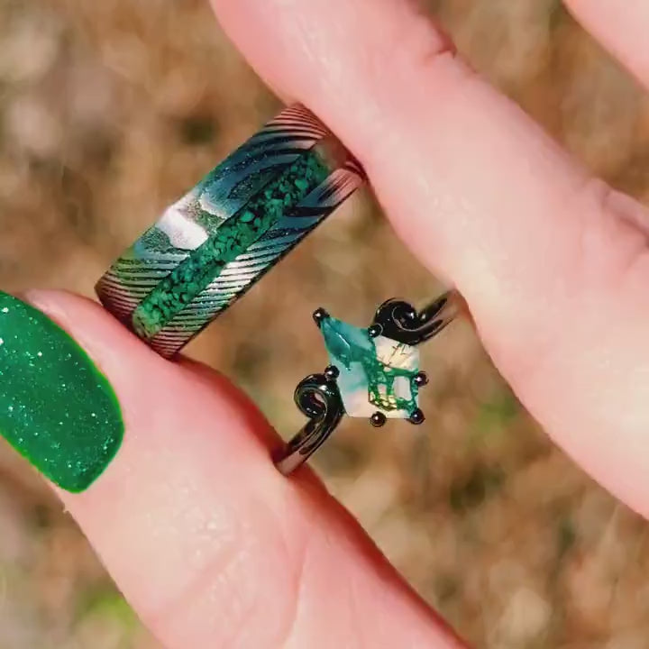 ►Our handcrafted Damascus Ring with a natural green moss agate inlay offers a stunning blend of rugged craftsmanship and organic beauty. The 8mm stainless steel band’s intricate pattern evokes a sense of timeless strength, making it a meaningful choice as a wedding ring or promise ring. Its nature-inspired design also makes it a unique anniversary gift, with the option for personalized engraving to create a one-of-a-kind keepsake that reflects your lasting bond.