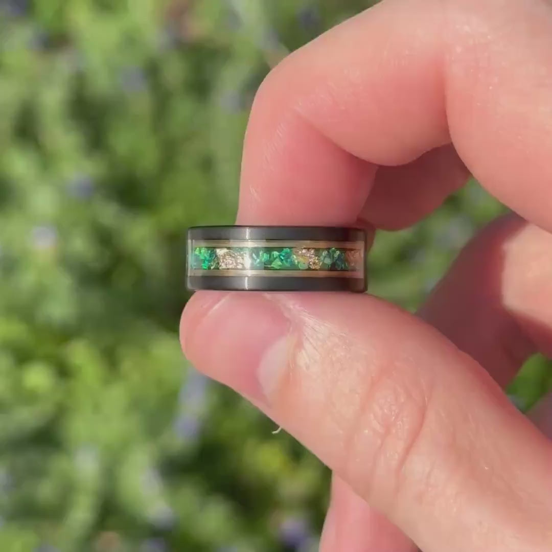 Mens Opal Ring, Emerald Wedding Band, Green and Gold, 8mm Black Tungsten Ring, Green Fire Opal, Men Gold Leaf Ring, Two Tone Ring, Engrave