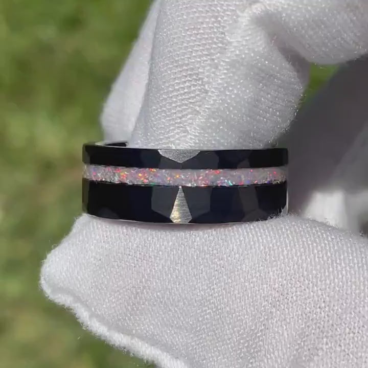 Mens Opal Wedding Band, Black Tungsten Ring, 8mm-6mm, Crushed White Fire Opal, Hammered, Brushed, Flat, Man Engagement Ring, Engraving