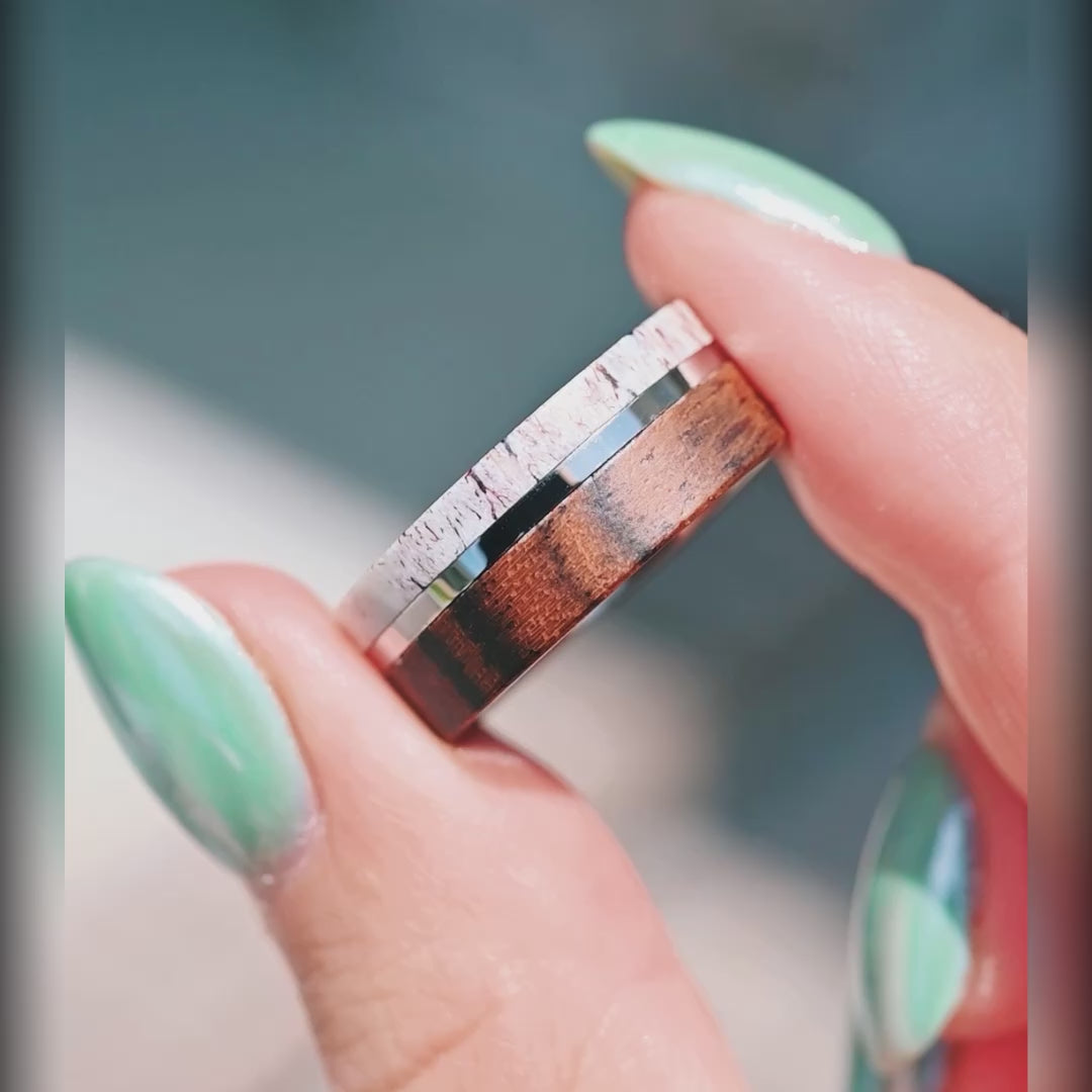 Handcrafted from durable silver tungsten, this men’s ring features salvaged wood and naturally shed antler for a rugged, earthy look. A meaningful wedding or promise ring for outdoorsmen, hunters, or anyone drawn to the untamed beauty of nature.
