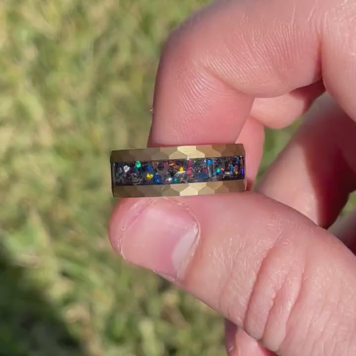 ►Celebrate your unique connection with this Meteorite and Galaxy Opal Ring Set, crafted in elegant yellow gold tungsten with hammered, flat, and brushed details. Designed with an 8mm band for him and a 4mm band for her, this comfort-fit set offers a perfect blend of modern style and timeless symbolism. Ideal as a wedding ring or promise ring, it embodies strength and love. Perfect as an anniversary gift, this stunning ring set can also be personalized with engraving, creating a heartfelt keepsake for your love story.