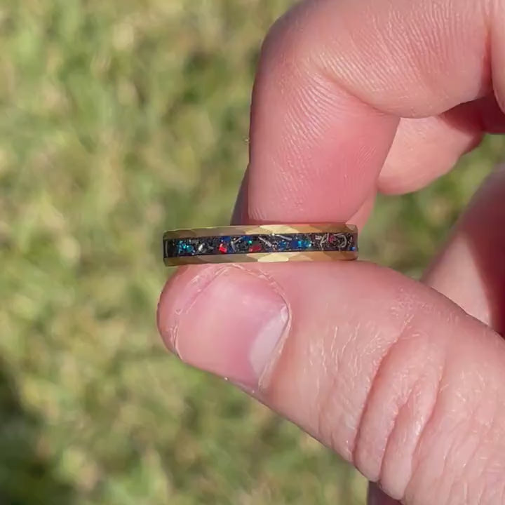 ►The Meteorite Galaxy Opal Wedding Band is a stunning gold tungsten ring with a hammered, flat, and matte brushed finish, making it a truly unique choice for both men and women. Whether you're celebrating your union with a wedding ring, marking a milestone with a promise ring, or selecting a meaningful anniversary gift, this ring combines elegance and durability. The authentic meteorite inlay adds a cosmic touch, and the option for custom engraving ensures a personal and timeless keepsake that reflects your enduring bond.