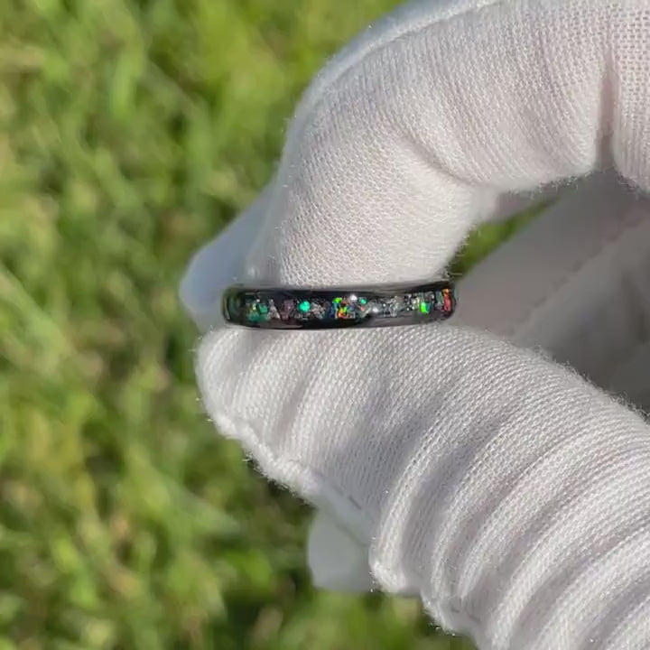 Meteorite Opal Ring, Galaxy Wedding Band, Authentic Meteorite Band, Dome, Polish, Black Tungsten Ring, Women Men, Fire Opal Ring, Engraving