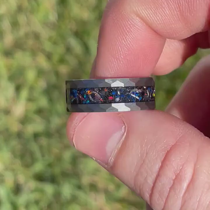 Meteorite Opal Ring, Mens Wedding Band, Galaxy Ring, Authentic Meteorite Ring Men, Fire Opal Tungsten Ring, Hammered Band, Ring Engraving