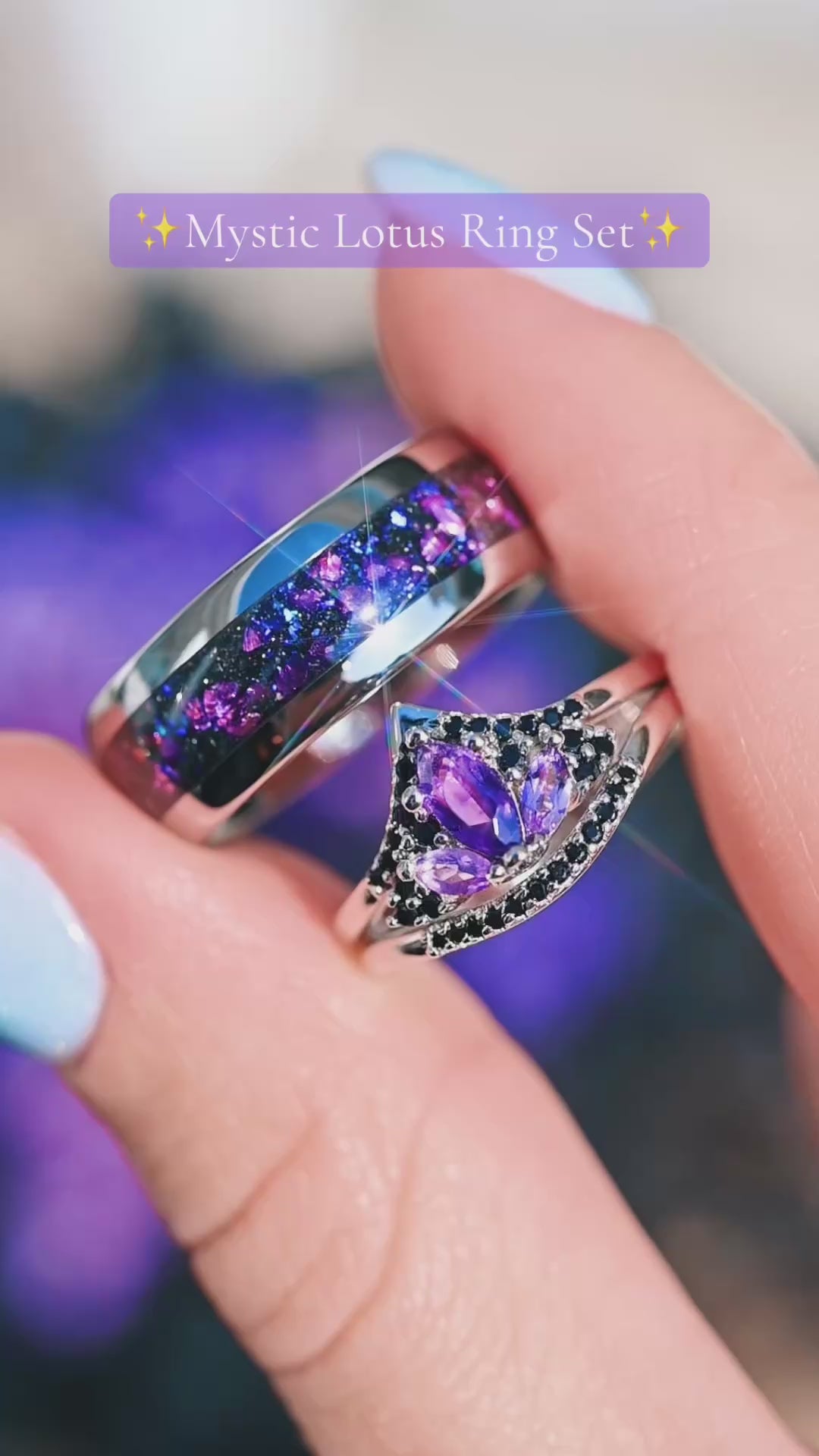 A love as deep as the cosmos - this ring set is a tribute to your unique bond. Her ring, crafted in sterling silver, features a natural amethyst embraced by black diamond accents. His tungsten carbide band, with a nebula-inspired inlay, mirrors the mystery of the stars. Together, they tell a story of love that’s written in the universe.
