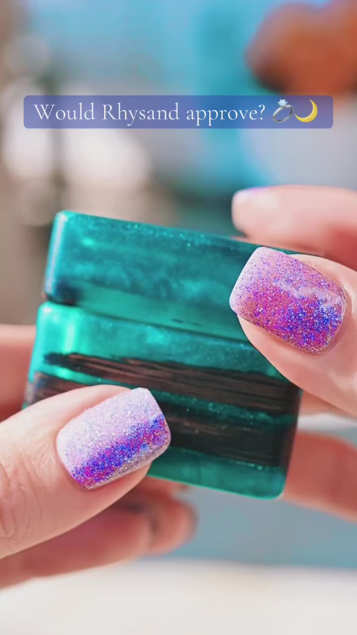 The Nesta Rift Nebula Ring features shimmering blue sandstone. It's inspired by the starry skies of Velaris, while the black rhodium symbolizes the strength and shadows of the Night Court. This ring set is a tribute to a love written in the stars.