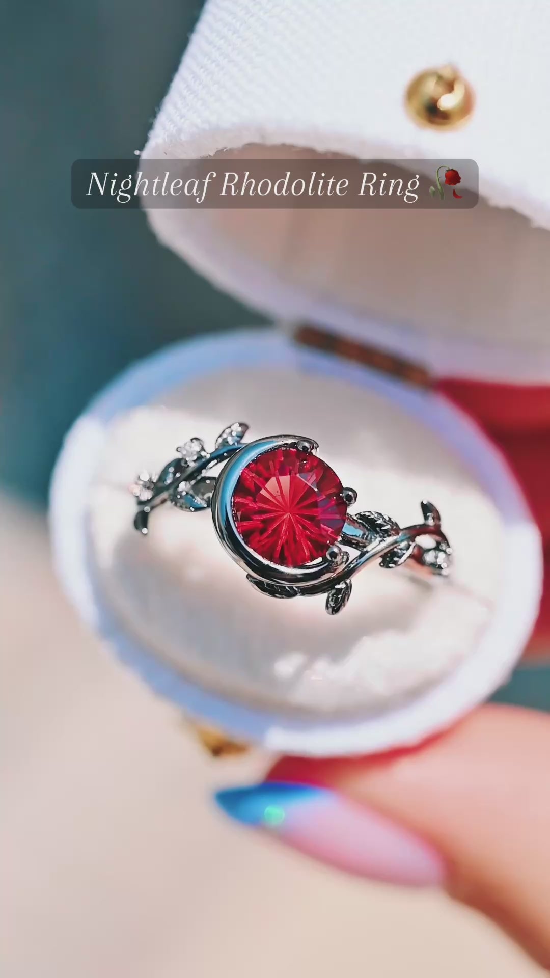 Nightleaf – A dreamy sterling silver ring with leafy vines curling around a crescent moon, cradling a glowing rhodolite. Where nature meets moonlight.