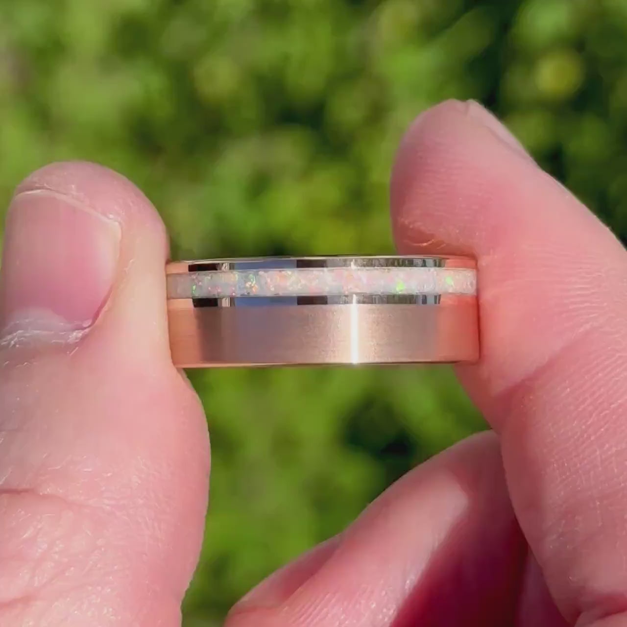 Opal Ring Men, Rose Gold Wedding Band, Personalized Gift, White Fire Opal, Man Tungsten Ring, 8mm Brushed Flat Ring, Unique Ring for Him