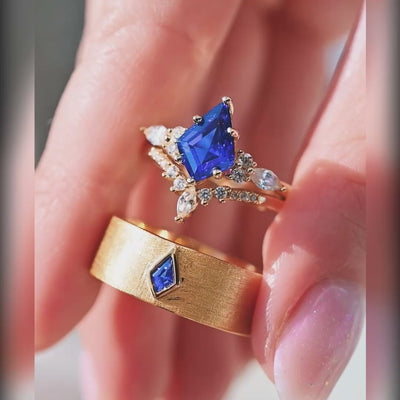 A distinctive take on a classic wedding set, this kite cut sapphire ring pairing is designed for couples who want something refined yet personal. Her set features a sterling silver engagement ring with real gold plating, centered with a kite-cut sapphire and framed by CZ accents, paired with a matching curved wedding band. His ring is crafted from sterling silver with real gold plating and a brushed flat profile, set with a kite-cut sapphire for a bold but clean finish. A coordinated his and hers ring set that balances modern shape with timeless gold tones for everyday wear.