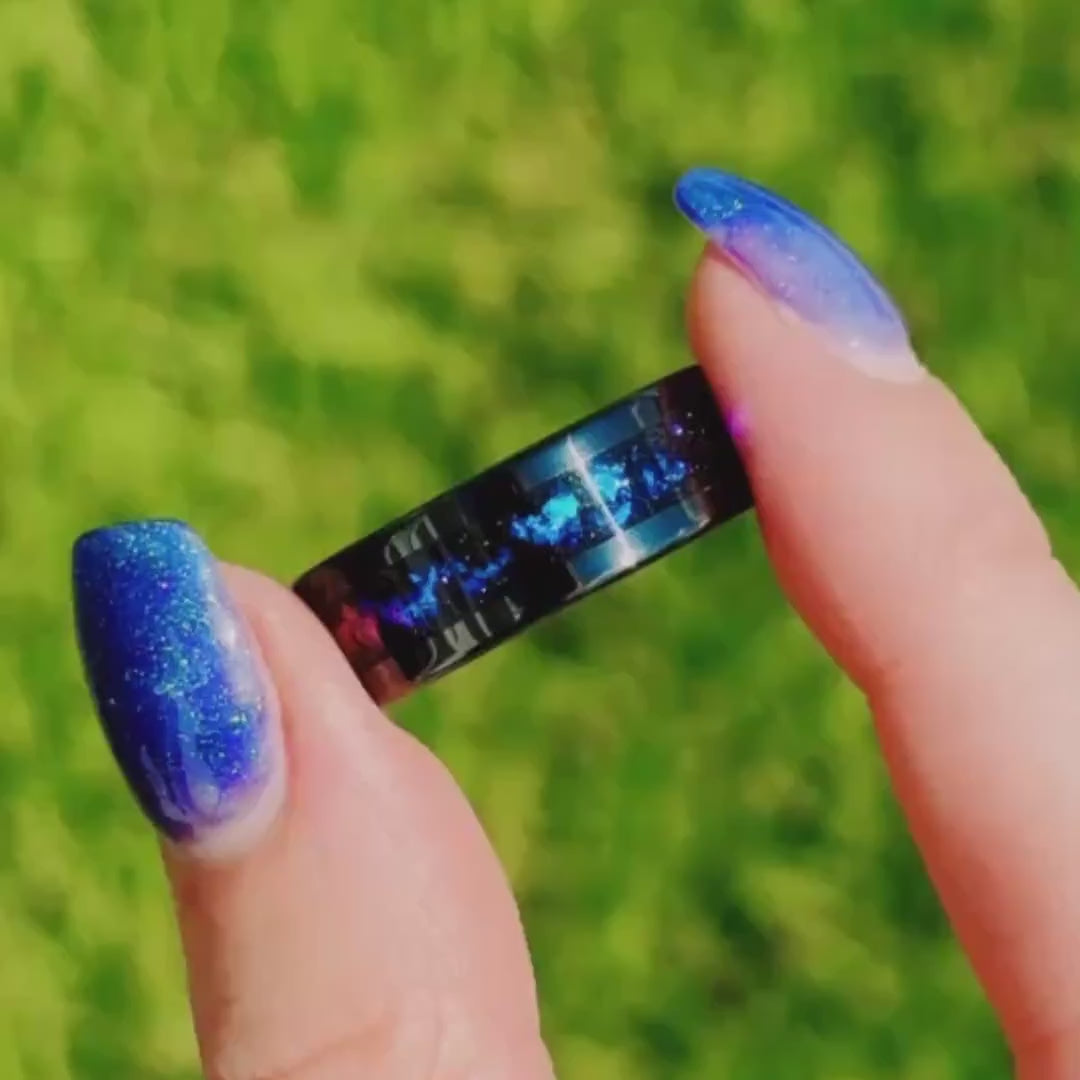►The Orion Nebula Ring, crafted from durable black ceramic, features a stunning blue nebula-inspired inlay and a sleek flat design. Perfect for both men and women, this unique ring is an exceptional choice as a wedding ring, promise ring, or anniversary gift. Its cosmic design symbolizes love and commitment, while custom engraving allows you to personalize it, creating a meaningful keepsake for any special occasion. This outer space-inspired band combines style, comfort, and individuality.