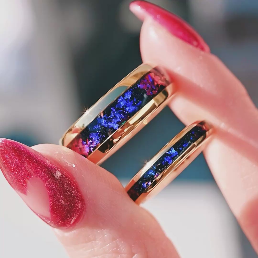 ►The Orion Nebula Ring, a 4mm tungsten band with a vibrant blue nebula design and a sleek yellow gold dome finish, is a perfect choice for both men and women. This unique outer space-inspired ring symbolizes eternal love and commitment, making it an ideal wedding ring, promise ring, or anniversary gift. Its durable and elegant design ensures lasting beauty, while custom engraving allows you to create a personal keepsake for any special occasion. Perfect for those who love unique, celestial-inspired jewelry.
