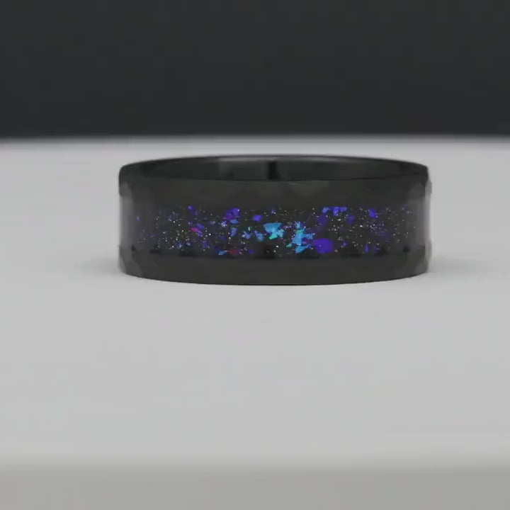 ►The Orion Nebula ring is a striking black tungsten band featuring a hammered, flat brushed finish with a vibrant blue nebula-inspired inlay. Available in 8mm, 6mm, and 4mm widths, this unique outer space ring is perfect for both men and women. Its celestial design makes it an ideal choice as a wedding band, promise ring, or anniversary gift. Crafted for durability and style, it offers a comfortable fit for everyday wear. Add custom engraving to make it a personalized keepsake for any special occasion.