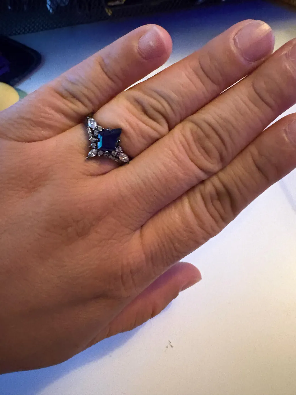 ►Her ring has a purple-blue simulated sapphire center stone accented with simulated diamonds