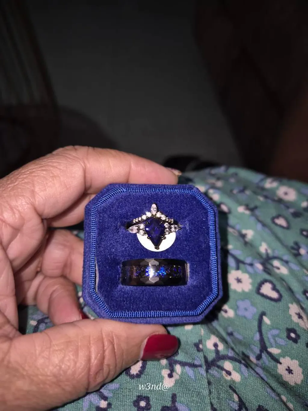 ►The Orion Nebula Ring Set is a stunning outer space-inspired design, perfect for couples seeking meaningful wedding rings, promise rings, or anniversary gifts. Featuring a combination of tungsten with a crushed sandstone inlay and black gold-filled 925 silver with a sapphire center stone, these his and hers bands evoke the beauty of the cosmos. Each ring offers the option for custom engraving, making it a truly personal symbol of your shared love and commitment.