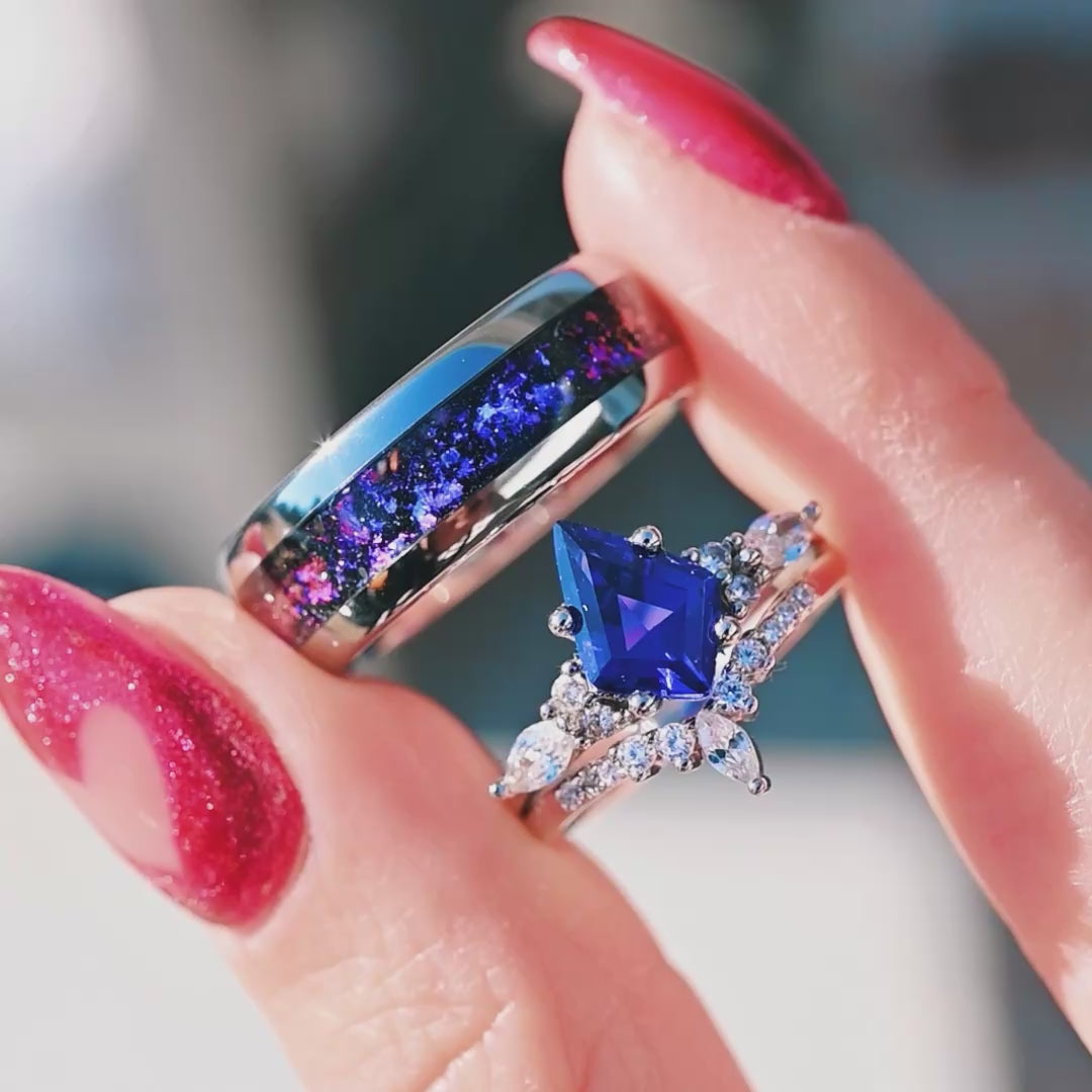 Orion Nebula Ring Set, His and Hers Wedding Band, Sapphire, Silver Ring, Outer Space Couples Ring, Silver Tungsten and 925 Silver