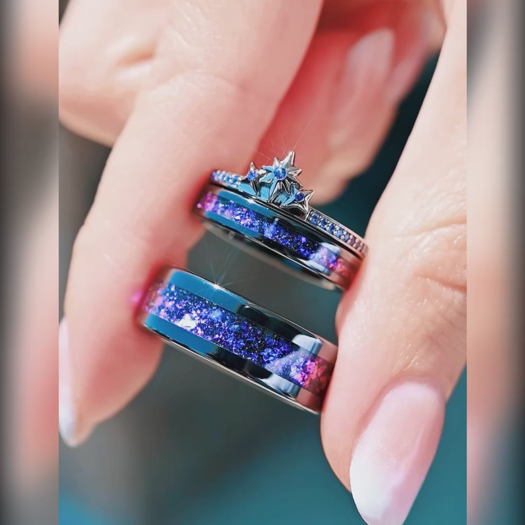 Inspired by the Orion Nebula, this cosmic set features durable black ceramic wedding bands and a sterling silver stacking star ring with blue sapphire accents – perfect for couples seeking celestial rings that symbolize a love as vast as the universe.