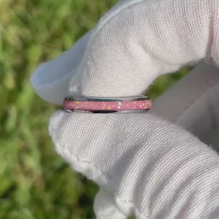 Pink Opal Ring, Woman Tungsten Wedding Band, Pink Fire Opal Band, Pink Band, Women Men Ring, Silver Tungsten Ring, Dome, Polish, Engraving