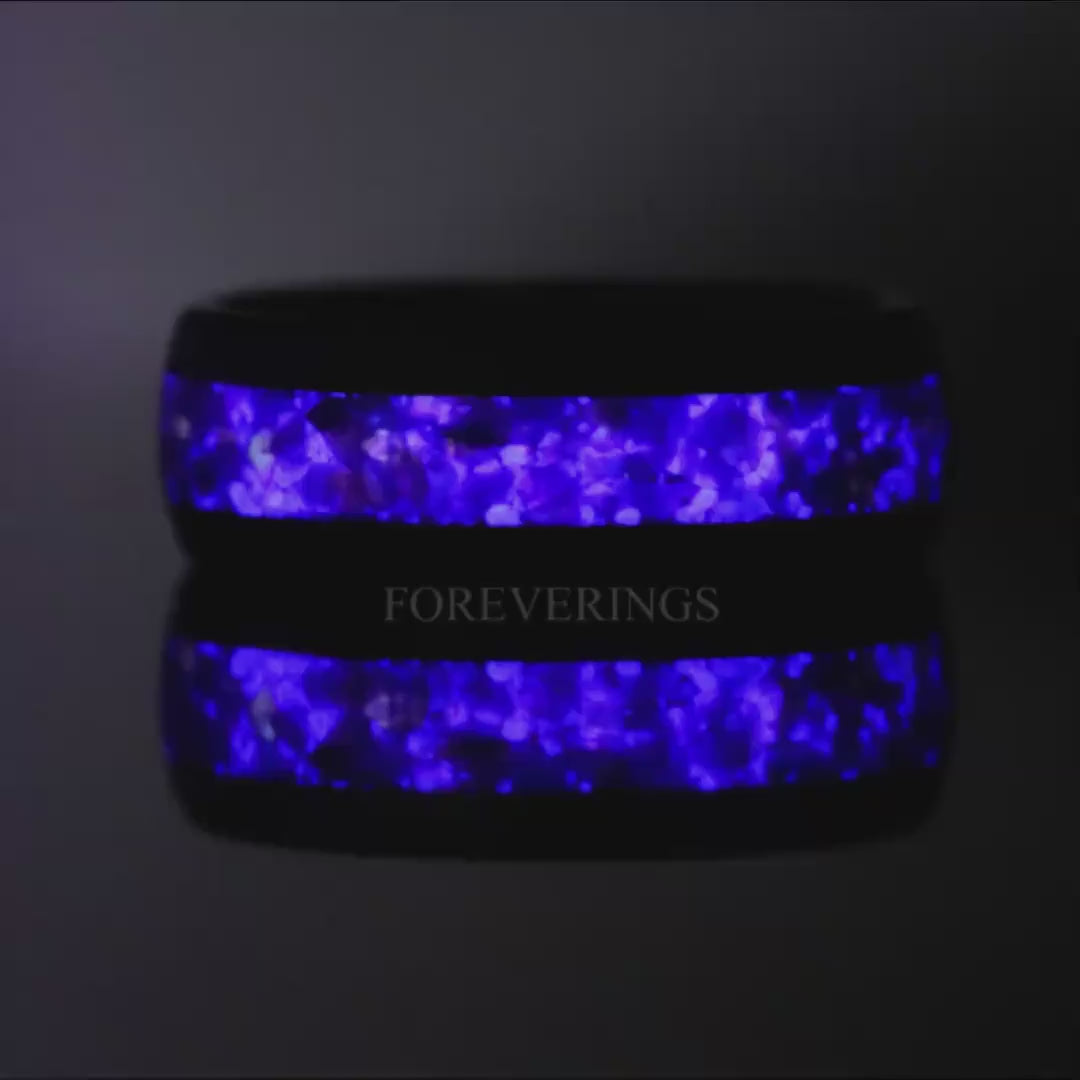 Purple Glow in the Dark Man Ring, Black Tungsten Ring, 8mm Mens Wedding Band, Polish Smooth, Unique Ring for Him, Ring Engraving
